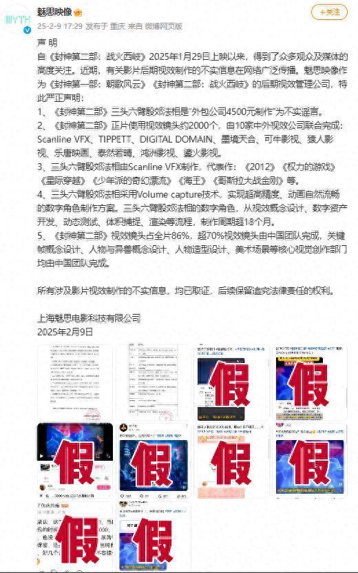 自《封神第二部:战火西岐》2025年1月29日上映以来,得到了众多观众及媒体的高度关注。近期,有关影片后期视效制作的不实信息在网络广泛传播。魅思映像作为《封神第一部:朝歌风云》《封神第二部:战火西岐》的后期视效管理公司,特此严正声明: